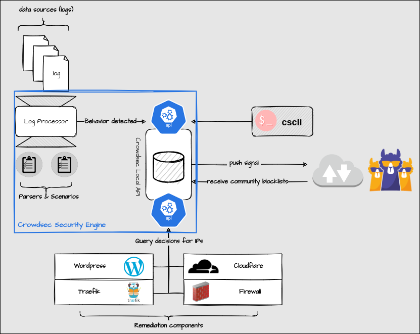 The CrowdSec Security Engine is an open-source, lightweight software that detects and blocks malicious actors from accessing your systems at various levels, using log analysis and threat patterns called scenarios.