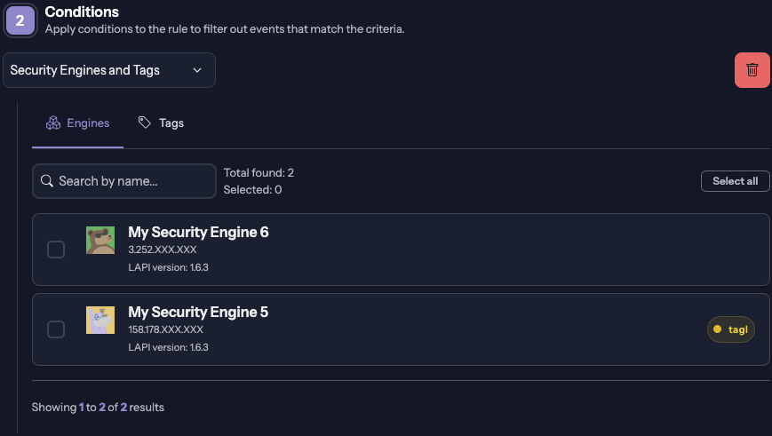 - (Optional) Select a conditions. Stack category allows you to filter on Security Engine(s). Threat Hunting > Alert trigger event allows you to select specific scenarios.