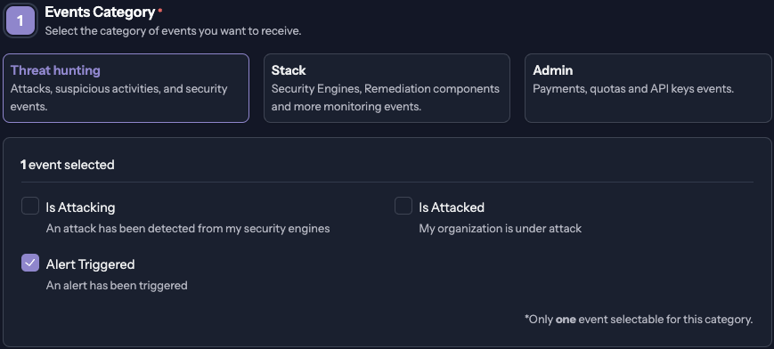 - Select the events you want to be notified about. You can only select one of the three category at the time (Threat Hunting, Stack or Admin). Each of these categories contains a list of events that you can choose from. (Threat hunting category let you select only one event due to its conditions variance).