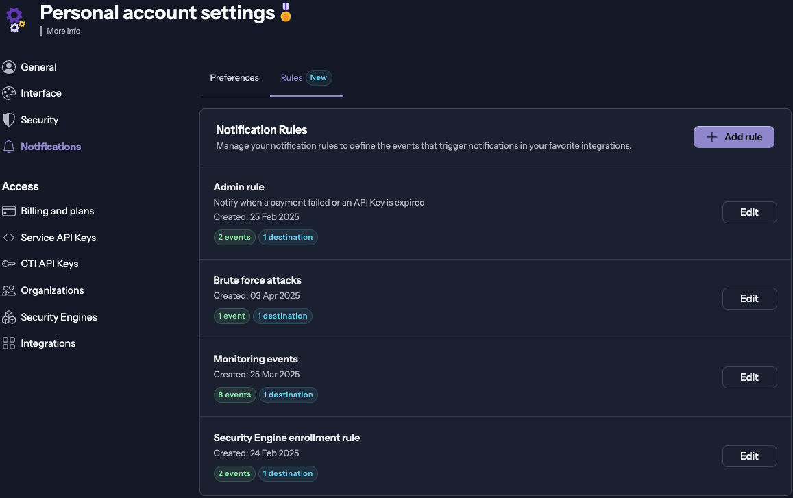 - In the CrowdSec Console, navigate to Settings > Notifications or Settings > Integrations > (integration of your choice) and click on add rule.