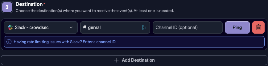 - Select destination, which is the integration you want to use for this rule. You can select multiple destination for one rule. Destination input varies depending on the integration you selected. For example, Slack integration let you select a channel, while Webhook integration let you select a URL.