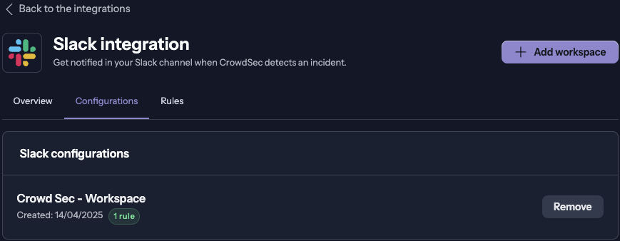 - In the CrowdSec Console, navigate to Settings > Integrations and then select Configure in the Slack row.